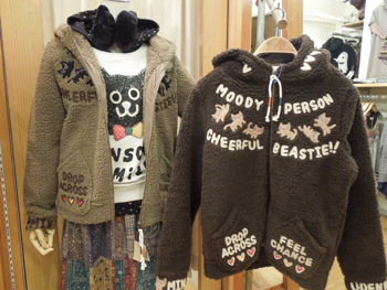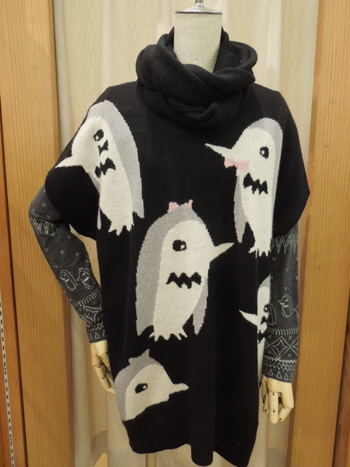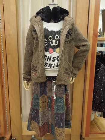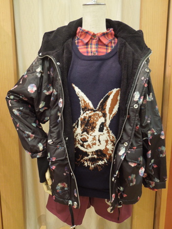 皆様お久しぶりです!!網江のブログの時間がやって来ました(*´∇`*)笑前回のブログで寒い寒いと言ってましたが、比べ物にならないぐらい一層寒くなりましたね(((( ;゚Д゚)))ガクガクブルブル私、家でハムちゃんを飼ってるんですが最近は寒いのか、ハウスにこもりっぱなしです・・・夏場は元気の有り余る子で、夜な夜な回し車を乗り回していました・・・”カラカラガラガラカラカラガラガラ・・・”私がケージをこっそり覗くと、なぜか私の顔をガン見しながらまたしてもひたすら乗り続け・・・”カラカラガラガラ”・・・笑『私すごいでしょ!!(`・ω・´)』といった顔で見つめてきます・・意味不明な行動が可愛いです・・完全なる親ばかです(*´д`*)笑そんな我が家の愛ハムのお話に無理やり乗っかりまして今日は、当店の”アニマルモチーフアイテム”をご紹介していきます★まずは、『SCOLAR』から★ごらんの通り真ん中にドドーンとうさぎです!!笑リアル柄がまたアニマル心をくすぐりますね・・・薄手のニットチュニックなので、マネキンのように柄シャツを重ねて着てもごわつかず、着易いです(*´д`*)つぶらな瞳で見つめてきます・・・ぜひ見に来て下さい(●´ω`●)笑NEXT アニマルはこちら!!こちらのマネキンが着用しているマフラーを除く商品すべてにどこかしらにアニマルモチーフがプリントされてます★その中でも網江がオススメするのがこちら・・・ネコ柄スカート!!(*´д`*)ごらんのとおり、ネコちゃんがこれでもかあああ!!と言わんばかりにしきつめられています・・・ネコちゃんがアフロ被ってたりとユニークでカラフルなプリント★・・・に!!なってますが!!こちら・・・裏返すと、雰囲気一変!!サテン生地のシックなネコ柄スカートに早変わり♪可愛いし万能ですねー・・・肌触りも抜群です(*´д`*)★そしてそして・・・個性派さんに是非!!是非とも!!(笑)オススメしたいのがこちら・・・ペンギン柄ニットチュニックです!!(おばけ柄じゃないですよ!!笑)ペンギン柄ってなかなか無いですよね・・・こちらも肌触りが滑らかでニットのガサつきが苦手な方にも着ていただけます♪これ1枚でお目立ち確定ですよ(●´ω`●)♪続いてのご紹介は・・・rough★roughでは、”にゃんこフェア”を開催中で、今年のトレンドネコモチーフアイテムがたくさん入荷していますヾ(〃^∇^)ノわぁい♪はい!!ネコです!!左側2つの商品は、薄手のスウェットになります★右側の総柄インナーカットソーは、当店人気商品です♪左胸元にはネコのワッペンが付いていてワンポイントに!!早くも色違いは当店分完売してしまいました・・・(ノд・。) グスンそんな不動の人気を誇るネコちゃんアイテムを使ってコーディネートしましたv(。・ω・。)♪中に着てるネコちゃんは、さっき紹介したスウェットです♪そして、上から羽織っているボアアウターにもネコちゃんがたくさん!!まず袖口に・・・フードに・・・前にも!!!v(。・ω・。)ィェィ♪