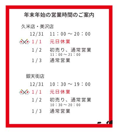 ![]() いつもユナイテッドオークをご愛顧いただきまして 誠にありがとうございます。 年末年始の各店舗の営業時間についてご案内申し上げます。 来年もユナイテッドオークをどうぞよろしくお願い申し上げます。 サタデーアフターヌーンセール2019/07/06 | イベント情報